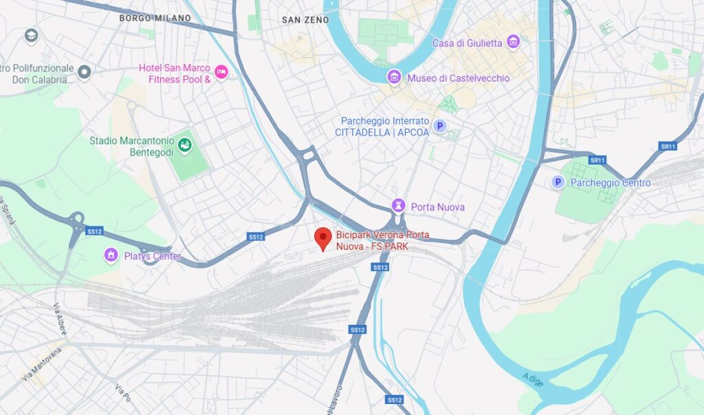 Bicipark Verona Porta Nuova, in Piazzale XXV Aprile. Accesso a pagamento con tesseramento da attivare in loco. Maggiori info.