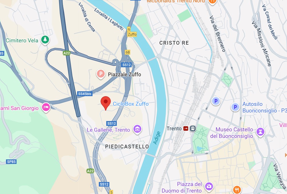 Parcheggio protetto per biciclette nell’Area Ex Zuffo,  via Dos Trento, con 228 stalli. Accesso tramite la tessera Mitt del trasporto pubblico provinciale e l’uso è gratuito per gli abbonati al trasporto pubblico e a Trenitalia, il costo giornaliero per non abbonati è di 1€.