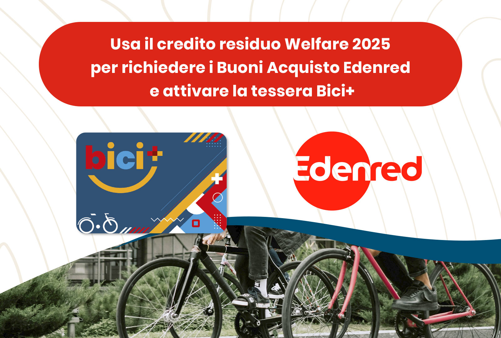 Usa il credito residuo per richiedere i Buoni Acquisto Edenred e acquista la Tessera Bici+ 2026. Approfitta della tariffa low cost di soli 24€/annui e regala la tutela per gli spostamenti in bici ed eBike anche ai tuoi cari.